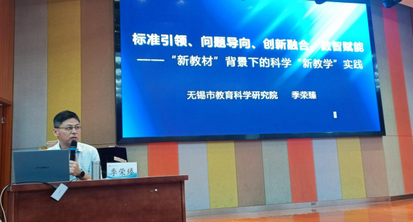下午,无锡市教育科研究院科学教研员季荣臻教研员(苏教版小学《科学》教材编写组员)带来《新教材背景下的新教学实践》讲座。他先点出当前教学的 “真痛点”:教学主题不科学、概念游离无逻辑、教学立意低、器材(数据)模糊等真问题,引发教师强烈共鸣。
